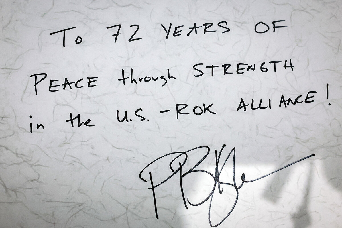 “72년 평화, 동맹의 힘” 피트 헤그세스 미 국방장관은 4일 서울 용산구 국방부 청사 방명록에 ‘한·미동맹의 힘으로 이룬 72년의 평화!(To 72 years of peace through strength in the U.S.-ROK alliance!)’라고 적었다. 사진공동취재단 |