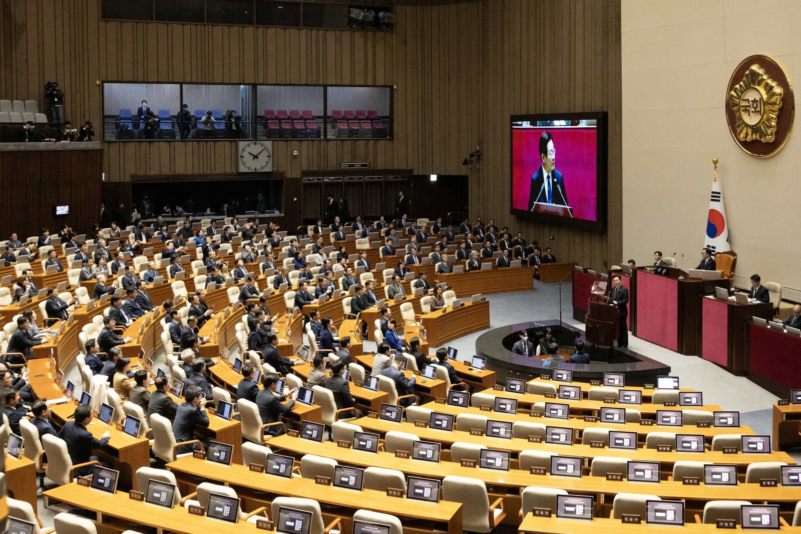 이재명 대통령이 4일 서울 여의도 국회의사당 본회의장에서 내년도 정부 예산안에 대한 시정연설을 하는 가운데 국민의힘 의원들의 자리가 비어 있다. News1 |