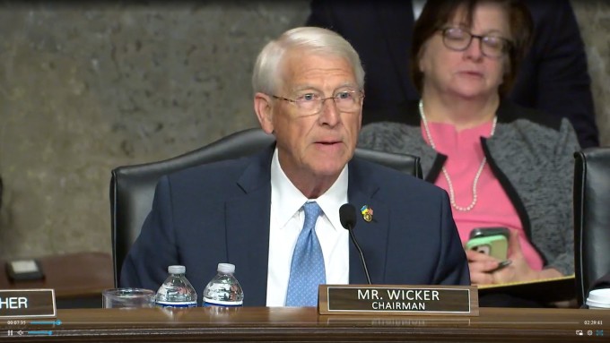 로저 위커 미국 상원 군사위원장이 11월4일 국방부 관리들에 대한 인준 청문회에서 발언하고 있다. [사진=상원 군사위 제공] |