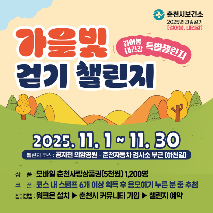 이번 챌린지는 춘천시 대표 걷기 프로그램인 ‘걸어봄, 내건강‘의 특별 이벤트로 일교차가 커지는 가을철에 줄어드는 신체활동을 보완하고 시민 누구나 일상 속에서 즐겁게 걷기를 실천하기위해 마련됐다.