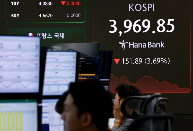 코스피는 전날 미 뉴욕증권서래소(NYSE)에서의 기술주 급락의 여파를 고스란히 맞으며 이날 장 초반 4% 넘게 하락했다. 코스피는 3900선까지 내려앉으며 7거래일 만에 장중 4000선을 내줬다.