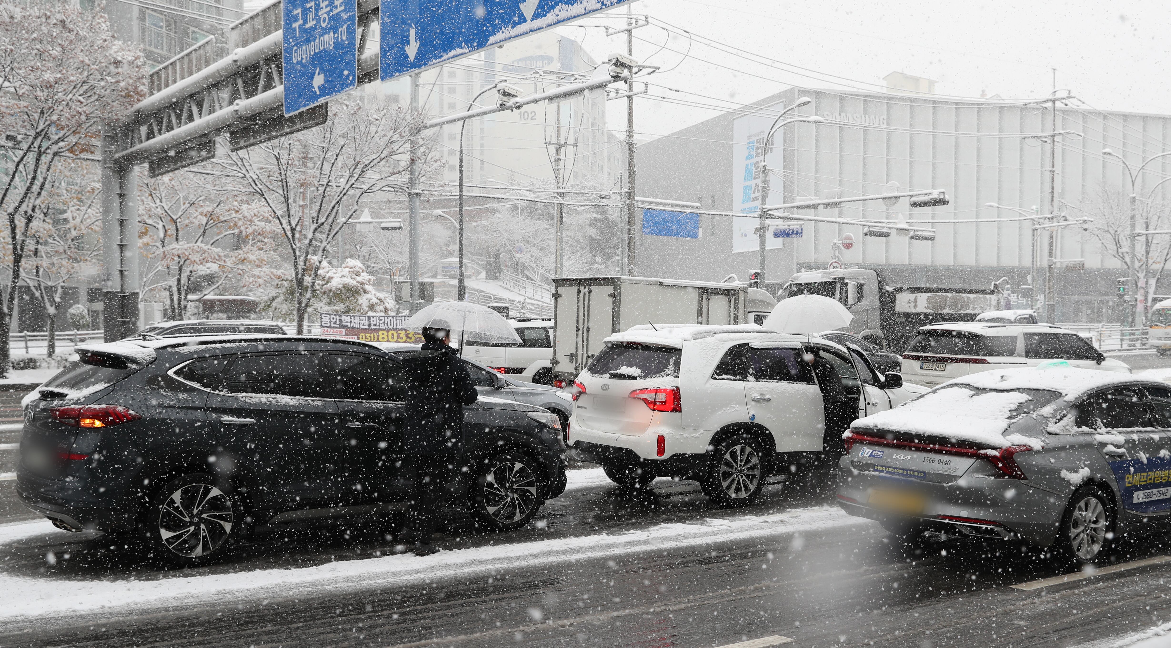 경기 용인시 기흥구 용구대로가 폭설로 인한 교통사고로 정체를 빚고 있다. /뉴스1 |