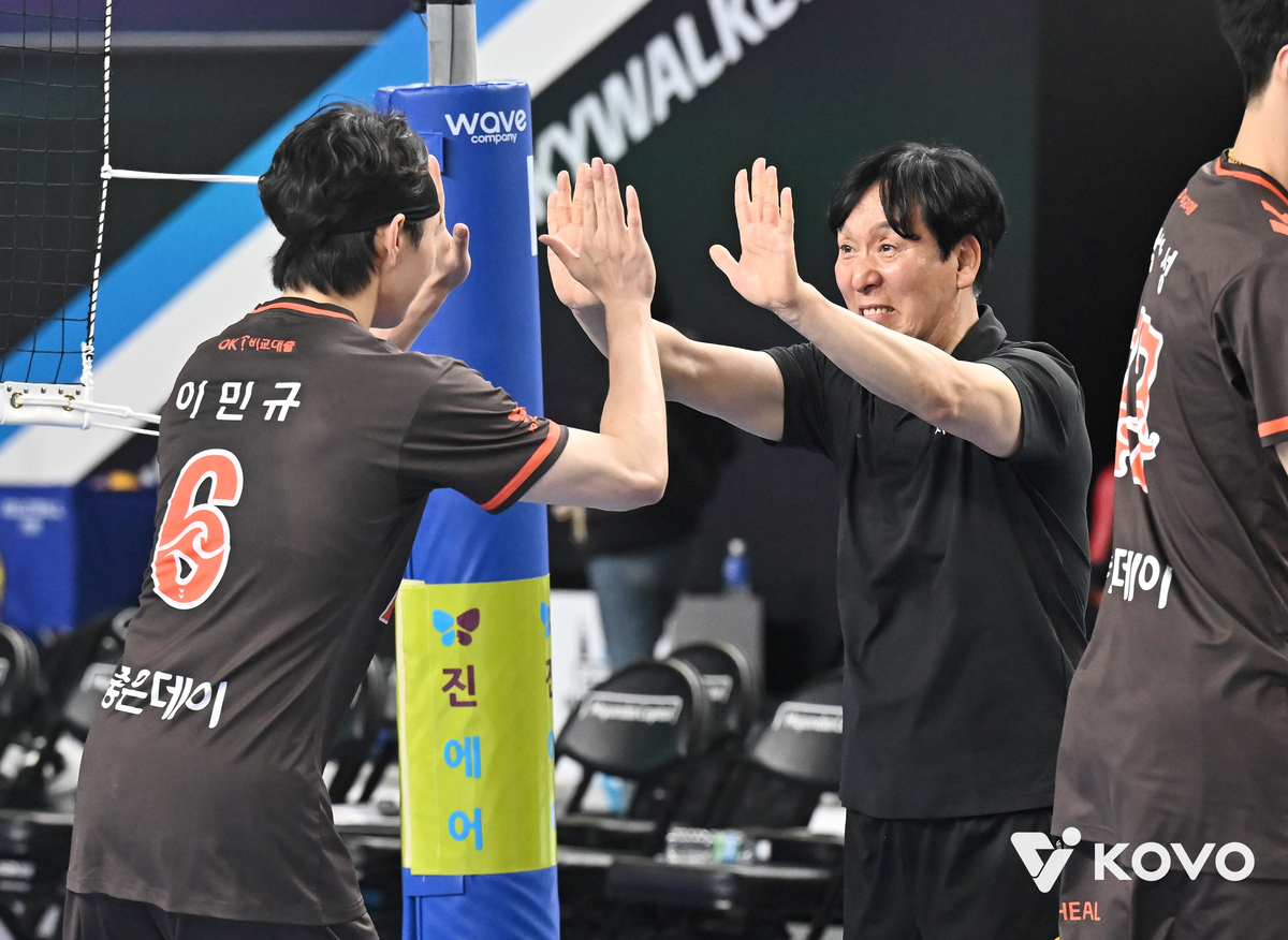 신영철 OK저축은행 감독(오른쪽)이 세터 이민규와 하이파이브를 나누고 있다. 사진=KOVO 제공 |