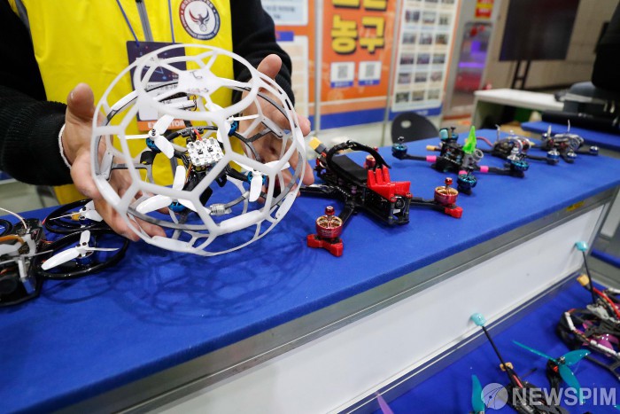 [고양=뉴스핌] 류기찬 기자 = 5일 오전 경기 고양시 킨텍스 제1전시장에서 열린 ‘2025 드론ㆍ도심항공모빌리티박람회’에서 레이싱 드론과 드론농구용 드론이 전시되어 있다. 이번 전시는 국내 최대 첨단기술 전시회 '대한민국 첨단기술 대전(RAD KOREA WEEK)'의 일환으로 개최되며, 로보월드, 디지털미디어테크쇼, 디지털퓨처쇼, 드론도심항공 모빌리티 박람회가 동시에 이루어진다. 2025.11.05 ryuchan0925@newspim.com