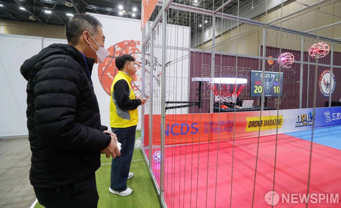 [고양=뉴스핌] 류기찬 기자 = 5일 오전 경기 고양시 킨텍스 제1전시장에서 열린 ‘2025 드론ㆍ도심항공모빌리티박람회’를 찾은 관람객들이 드론농구대회를 시연하고 있다. 이번 전시는 국내 최대 첨단기술 전시회 '대한민국 첨단기술 대전(RAD KOREA WEEK)'의 일환으로 개최되며, 로보월드, 디지털미디어테크쇼, 디지털퓨처쇼, 드론도심항공 모빌리티 박람회가 동시에 이루어진다. 2025.11.05 ryuchan0925@newspim.com