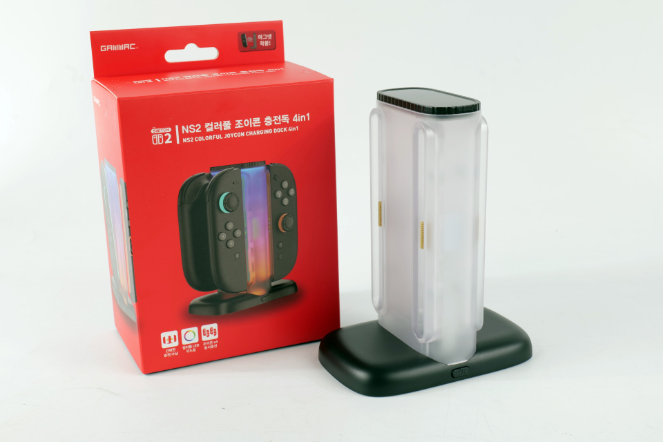 컬러풀 충전독은 무광 블랙 컬러와 투명 색상으로 구성된 제품이다. 거실이나 안방 등 다양한 공간에 두고 사용해도 위화감이 적은 디자인이 채택됐다. 최대 4개의 조이콘 2를 한 번에 충전할 수 있는 구성이며, 조이콘 2 충전부 하나당 2개의 자석과 충전 접점이 위치한 것을 알 수 있다.