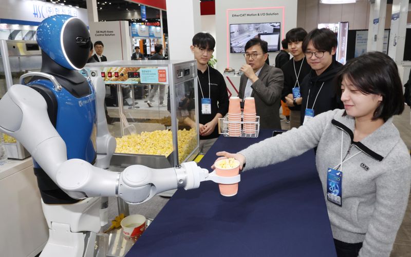 '2025 로보월드'가 5일 경기 고양시 킨텍스 제1전시장 1~2홀에서 열린 가운데 뉴로메카 휴머노이드 로봇이 팝콘을 담아 주고 있다. 사진=박범준 기자 |