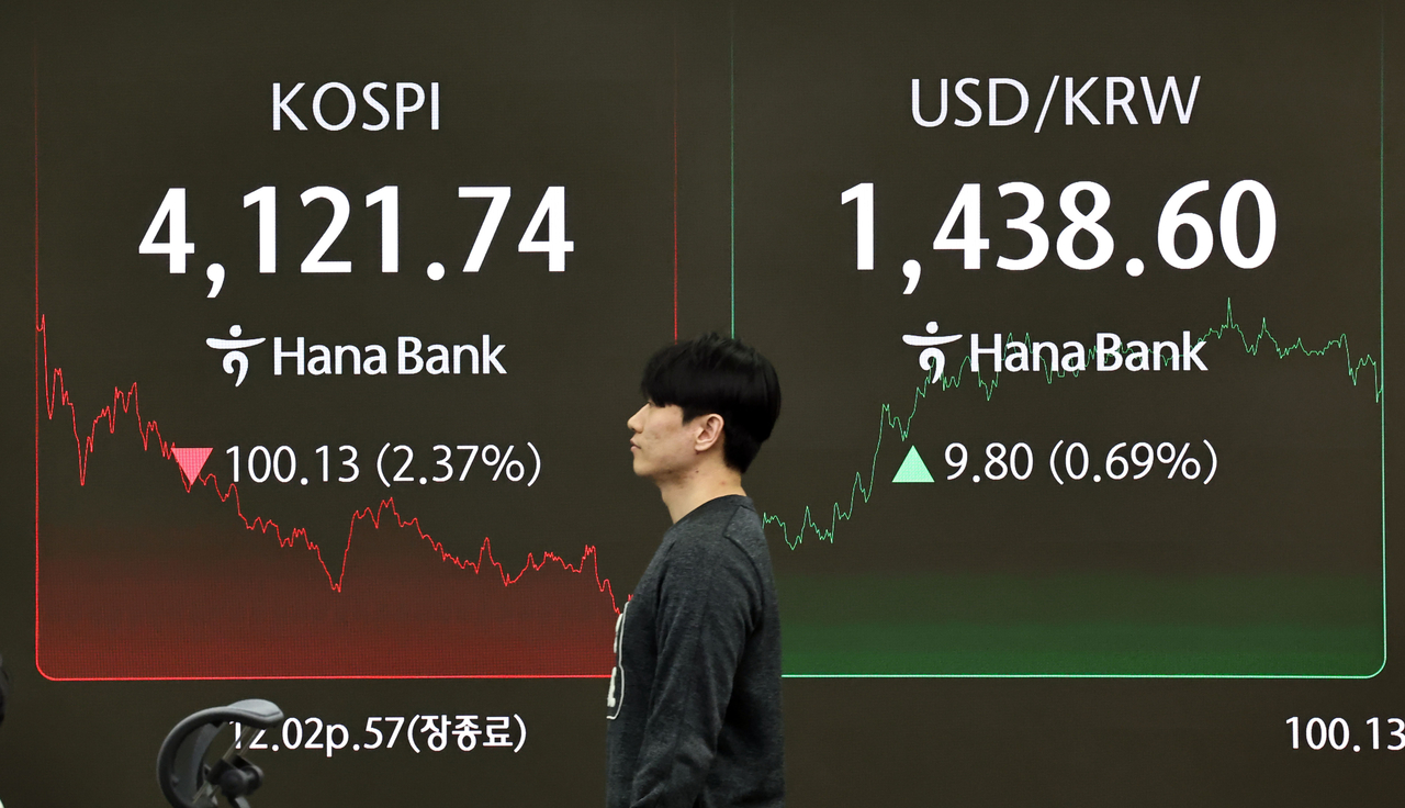4일 서울 중구 하나은행 딜링룸 현황판에 코스피 지수 등이 표시되고 있다. 이날 코스피 지수는 전 거래일 대비 100.13포인트(2.37%) 내린 4,121.74에, 코스닥은 12.02포인트(1.31%) 오른 926.57에 장을 마감했다. [연합] |