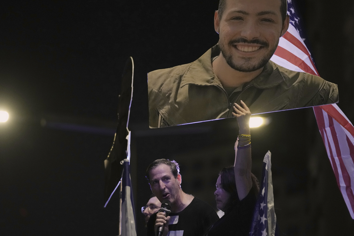 이스라엘계 미국인 이타이 첸의 부모가 지난 7월19일 인질로 잡혀간 아들의 사진을 들고 인질 즉각 석방과 전쟁 종식을 요구하는 시위에 참여하고 있다. 팔레스타인 무장정파 하마스가 전날 이스라엘로 인도한 시신은 4일(현지시간) 이타이 첸으로 확인됐다. AP연합뉴스 |