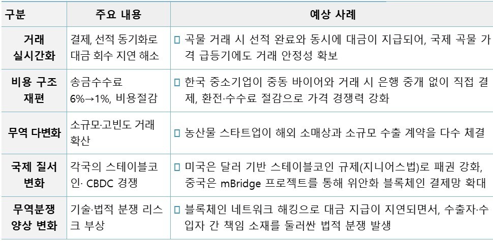 실제로 무역결제에 스테이블코인을 활용하면 국제송금 수수료를 기존 평균 6%에서 1% 내외로 낮추는 한편, 결제 시간도 기존 수일에서 수분 단위로 단축해 대금 회수 지연을 최소화하는 등 중소기업의 자금 운용 부담 완화 효과도 기대할 수 있다. 또한, 중개은행 없이 P2P 방식의 직접 결제가 가능해 금융 인프라가 취약한 신흥국과의 거래 접근성도 높일 수 있다.