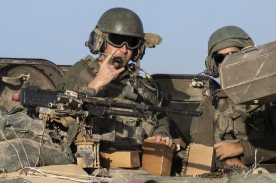 이스라엘 병사가 장갑차 위에서 손짓하며 가자지구 동쪽 지역으로 진입하기 위해 국경 철책 인근 게이트 쪽으로 이동하고 있다. UPI연합뉴스 |