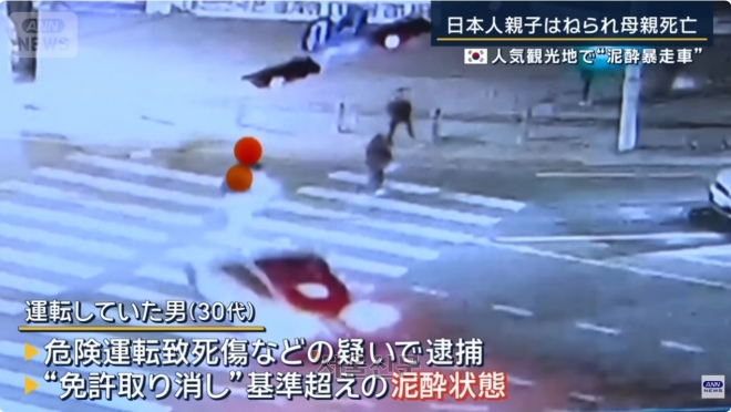 지난 2일 밤 10시2분께 서울 종로구 동대문역 사거리에서 소주 3병을 마신 상태로 혈중알코올농도 수치가 면허 취소 수준인 한국인이 몰던 차가 인도로 돌진해 횡단보도를 건너던 일본인 모녀를 쳤다. 30대 딸은 다치고, 50대 어머니는 숨졌다. 일본 오사카에서 온 모녀는 이날 오전 ‘효도 관광’을 위해 2박3일 일정으로 입국했으며 인근에 있는 낙산공원 성곽길에 가려다 사고를 당한 것으로 전해졌다. / ANN NEWS 캡쳐 |