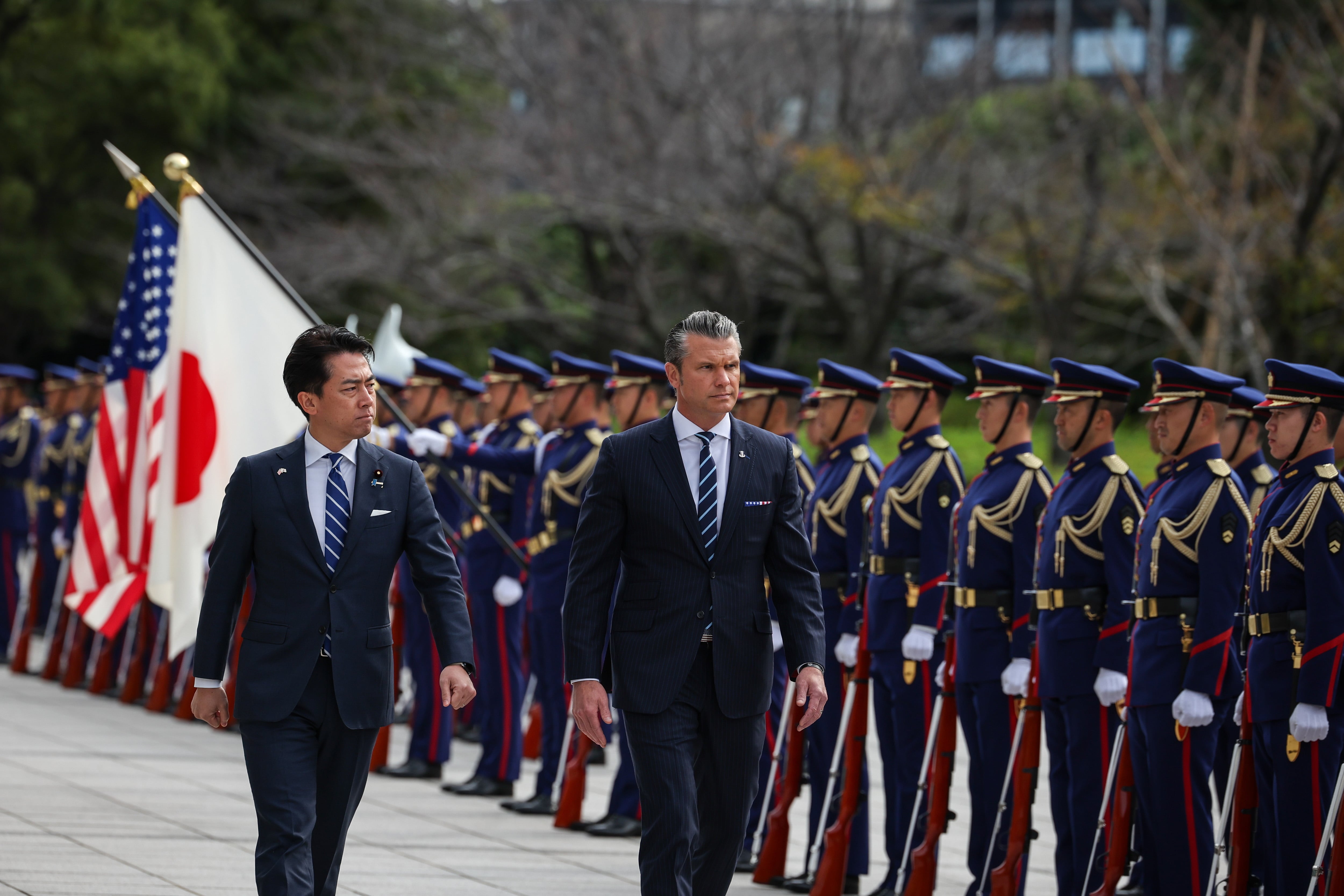 피트 헤그세스 미국 국방장관과 고이즈미 신지로 일본 방위대신이 10월 29일 일본 도쿄에서 의장대를 사열하고 있다. /EPA 연합뉴스 |