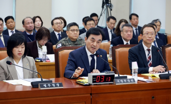 안규백 국방부 장관(앞줄 가운데)이 5일 서울 여의도 국회에서 2026년도 예산안, 기금운용계획안 등을 안건으로 열린 국방위원회 전체회의에서 의원 질의에 답하고 있다. /사진=뉴시스 |