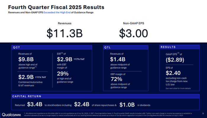 퀄컴은 2025 회계연도 4분기(7~9월) 매출이 전년 동기 대비 10% 증가한 112억7000만 달러(약 16조2400억원)를 기록했다고 5일(현지시간) 밝혔다.