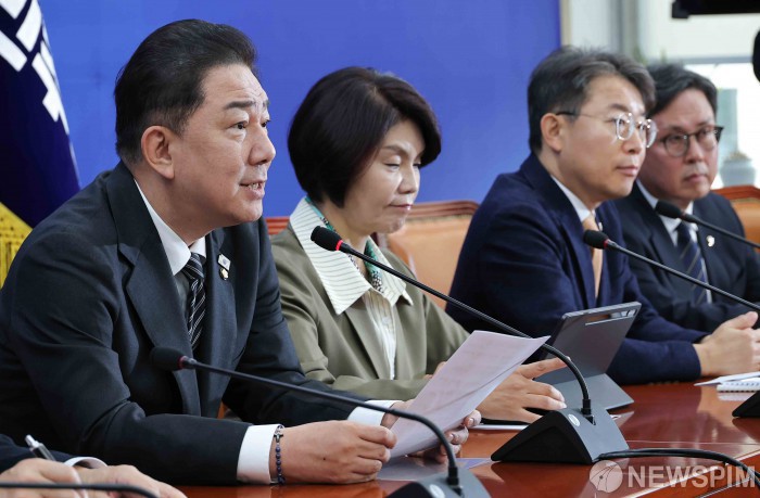 [서울=뉴스핌] 윤창빈 기자 = 김병기 더불어민주당 원내대표가 6일 오전 서울 여의도 국회에서 열린 정책조정회의에서 모두발언을 하고 있다. 2025.11.06 pangbin@newspim.com