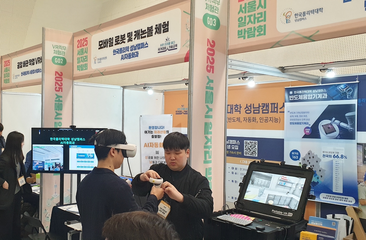 한국폴리텍대학은 행사장 내 ‘가상현실(VR) 직무체험관’을 운영하며 참가자들에게 미래 산업 현장을 실감 나게 체험할 수 있는 기회를 제공했다. 체험관에서는 ▷VR 공압배관 작업 ▷모바일 로봇·캐논볼 체험 ▷VR 반도체 공정 체험 ▷AI 인사이트 랩–SNS 빅데이터 체험 등 실습 중심 프로그램이 진행됐다.