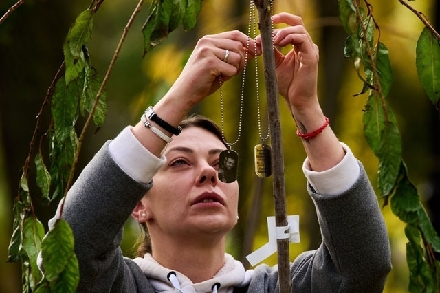 우크라이나 전쟁으로 희생된 군인들을 기리기 위해 우크라이나 키이우에 새로 조성된 ‘사랑의 거리’에서 한 여성이 전사한 남편의 인식표를 벚나무에 걸고 있다. AP 뉴시스 |