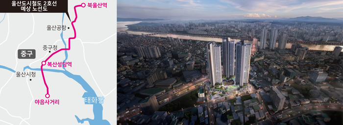 울산도시철도 2호선 예상 노선도·번영로 롯데캐슬 센트럴스카이 조감도. |