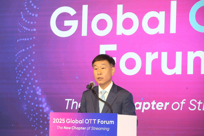 김영관 방송미디어통신위원회 사무처장 직무대리가 6일 서울에서 열린 '2025 국제 OTT 포럼'에서 개회사를 하고 있다. |