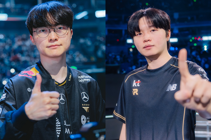 2025 LoL 월드 챔피언십 결승전에서 만나게 된 T1 ‘페이커’ 이상혁(왼쪽)과 KT 롤스터 ‘비디디’ 곽보성. 사진 | 라이엇 게임즈 |