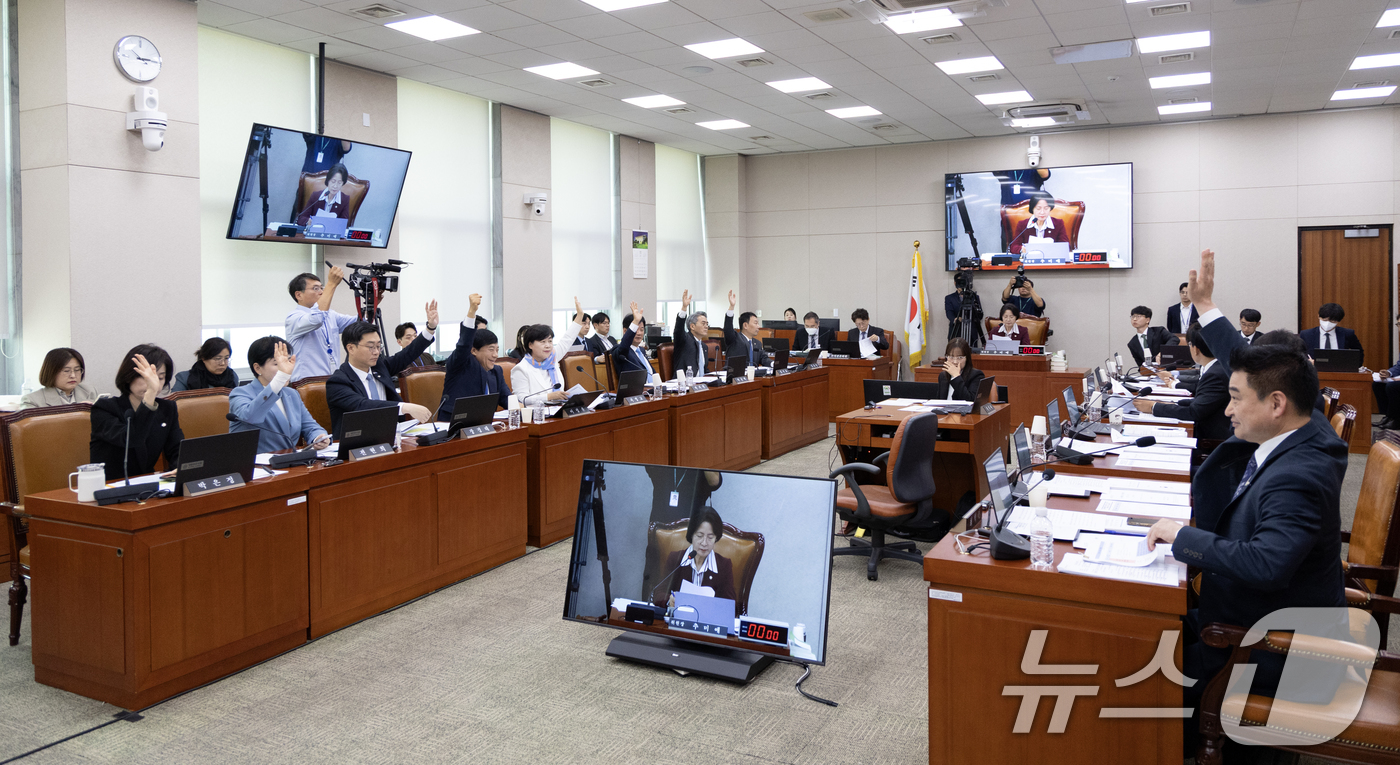 (서울=뉴스1) 이승배 기자 = 6일 서울 여의도 국회에서 열린 법제사법위원회 제429회국회(정기회) 제12차 전체회의에서 항공안전법 일부개정법률법안 등에 대한 토론 종결 거수투표가 진행되고 있다. 2025.11.6/뉴스1