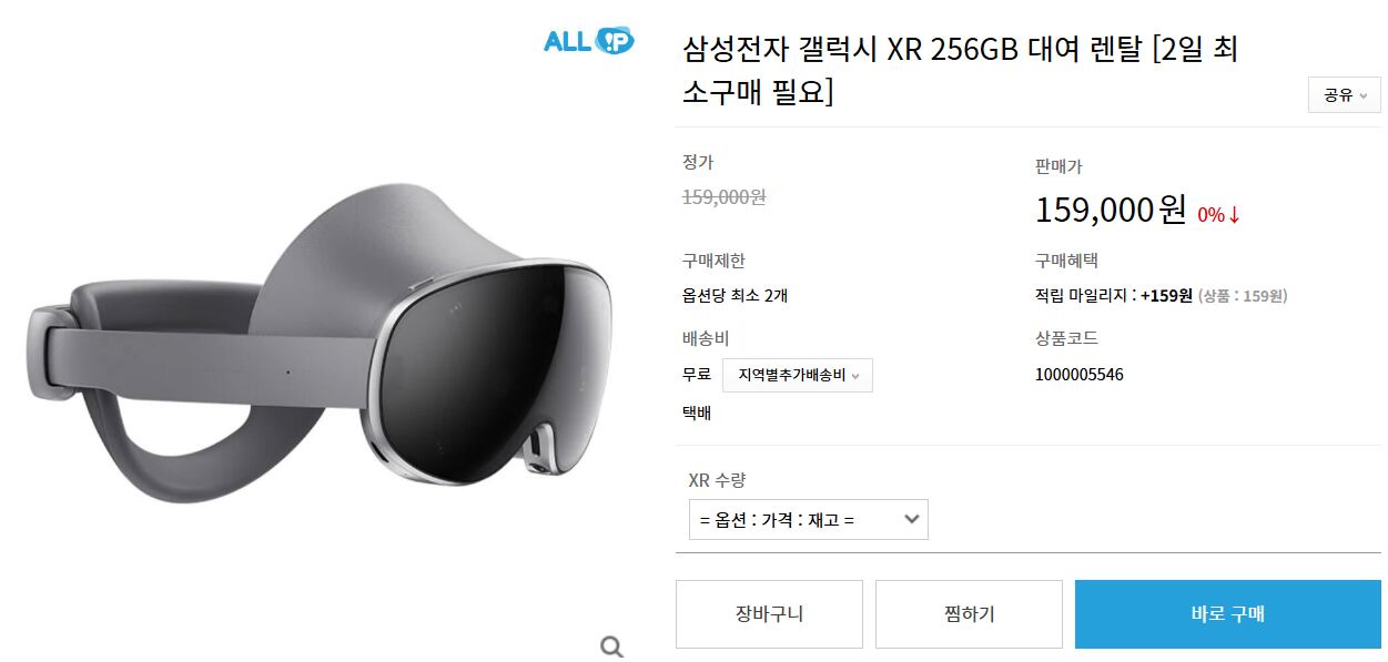 메타버스 유통 기업 올아이피정보통신이 운영하는 아이피몰은 삼성 갤럭시XR(256GB) 렌탈을 하루 15만9000원에 진행하고 있다./아이피몰 |