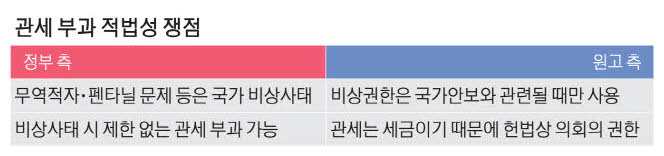 정부 측 법률 대리인 존 사우어 법무차관은 트럼프 대통령이 비상 권한을 사용한 것은 무역적자가 미국을 경제·국가안보적 재앙 직전 상태로 몰아넣고 있다고 판단했기 때문이라고 설명했다. 반면 소송을 제기한 중소기업을 대리하는 닐 카티알 변호사는 이에 맞서 "관세는 곧 세금"이라며 "(헌법을 만든) 우리 건국자들은 과세 권한을 오로지 의회에만 부여했다"고 반박했다.