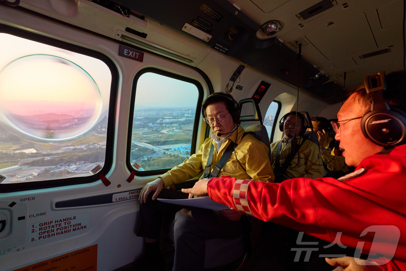 (서울=뉴스1) 이재명 기자 = 이재명 대통령이 6일 강원도 원주시 산림항공본부에서 열린 산불진화 관·군 합동훈련 점검에서 산불 진화 헬기에 탑승해 동해안 일대를 시찰하고 있다. (대통령실 제공. 재판매 및 DB 금지) 2025.11.6/뉴스1