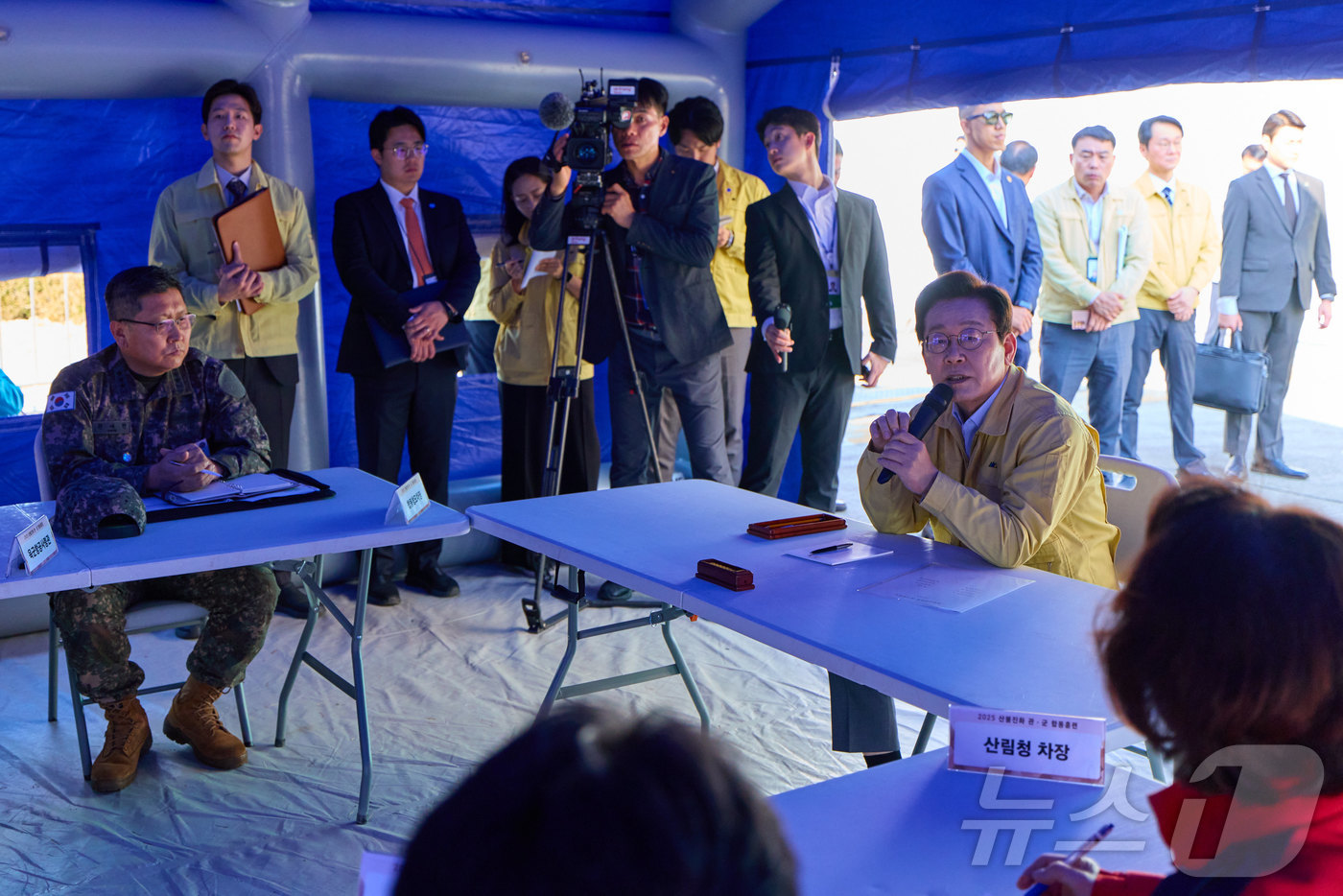 (서울=뉴스1) 이재명 기자 = 이재명 대통령이 6일 강원도 원주시 산림항공본부에서 열린 산불진화 관·군 합동훈련을 참관한 뒤 발언하고 있다. (대통령실 제공. 재판매 및 DB 금지) 2025.11.6/뉴스1