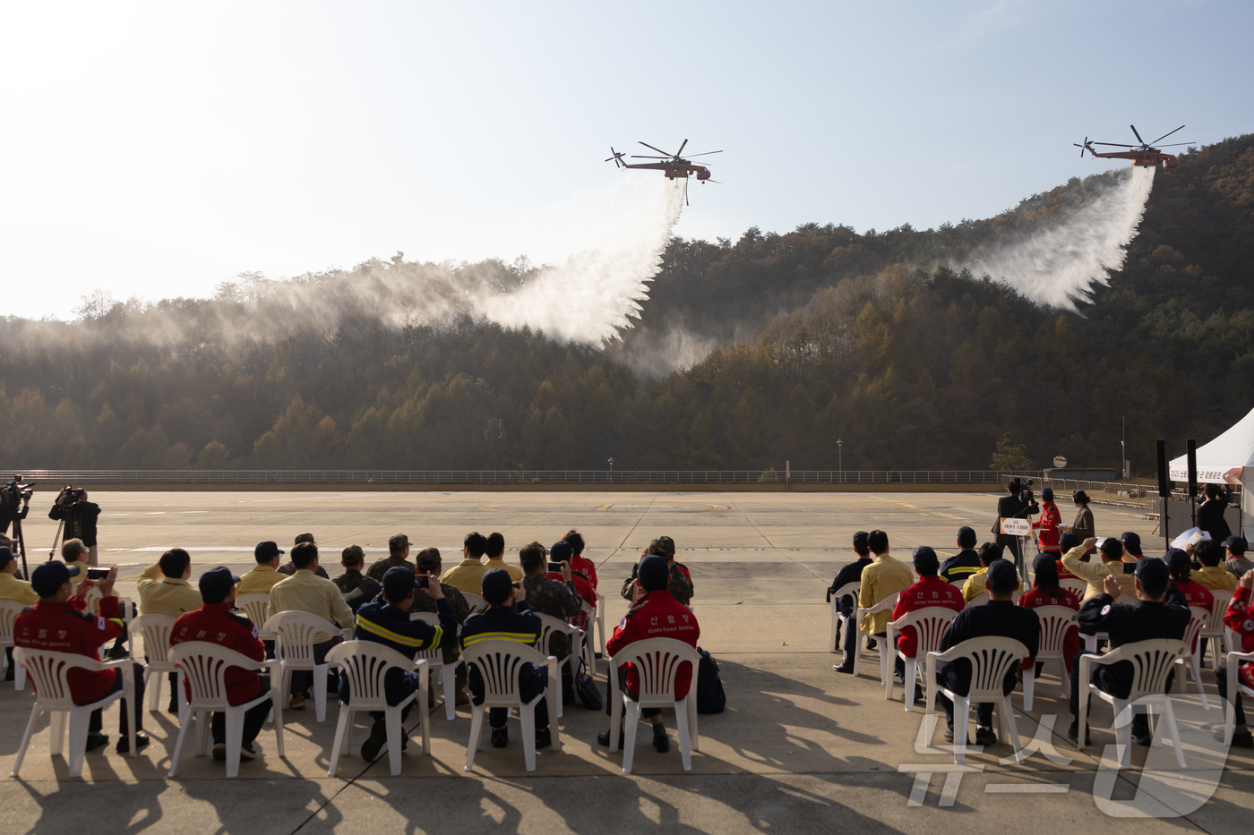 (서울=뉴스1) 이재명 기자 = 이재명 대통령이 6일 강원도 원주시 산림항공본부에서 열린 산불진화 관·군 합동훈련을 참관하고 있다. (대통령실 제공. 재판매 및 DB 금지) 2025.11.6/뉴스1