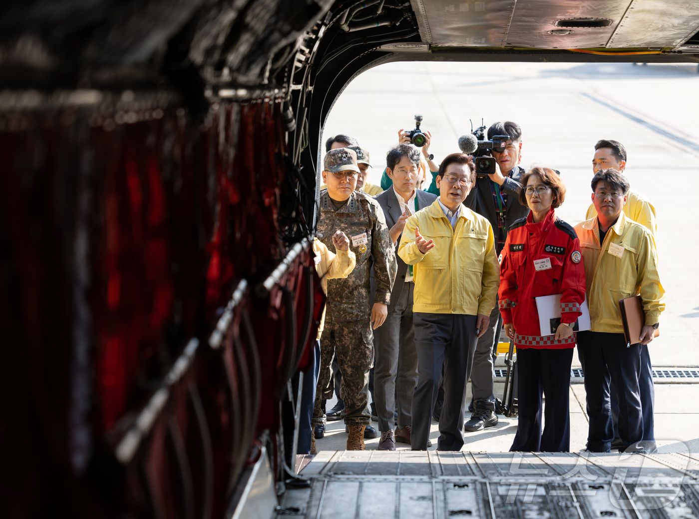 (서울=뉴스1) 이재명 기자 = 이재명 대통령이 6일 강원도 원주시 산림항공본부에서 열린 산불진화 관·군 합동훈련 점검에서 산불진화장비를 시찰하고 있다. (대통령실 제공. 재판매 및 DB 금지) 2025.11.6/뉴스1