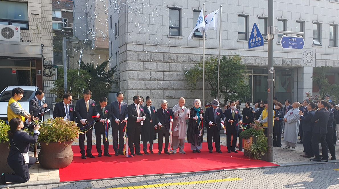 한국종교협의회는 6일 회관을 서울 중구 필동으로 이전하고 주요 참석자들이 회관 앞에서 현판식 테이프 커팅을 하고 있다. |