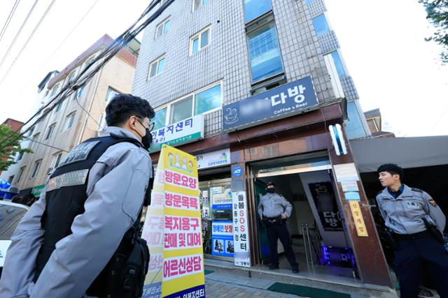 지난 4일 서울 강동구 천호동의 한 재개발조합 사무실에서 흉기 난동 사건이 발생, 출동한 경찰이 현장을 통제한 채 조사를 하고 있다. 뉴스1 |