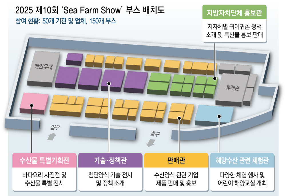 이번 Sea Farm Show에는 5개 공공기관과 10개 지자체, 35개 민간기업 등 총 50곳이 참여한다. △기술·정책관 △해양수산 체험관 △지방자치단체 홍보관 △수산물 특별기획전 △판매관 등에서 150개 부스를 마련해 관람객을 맞는다.