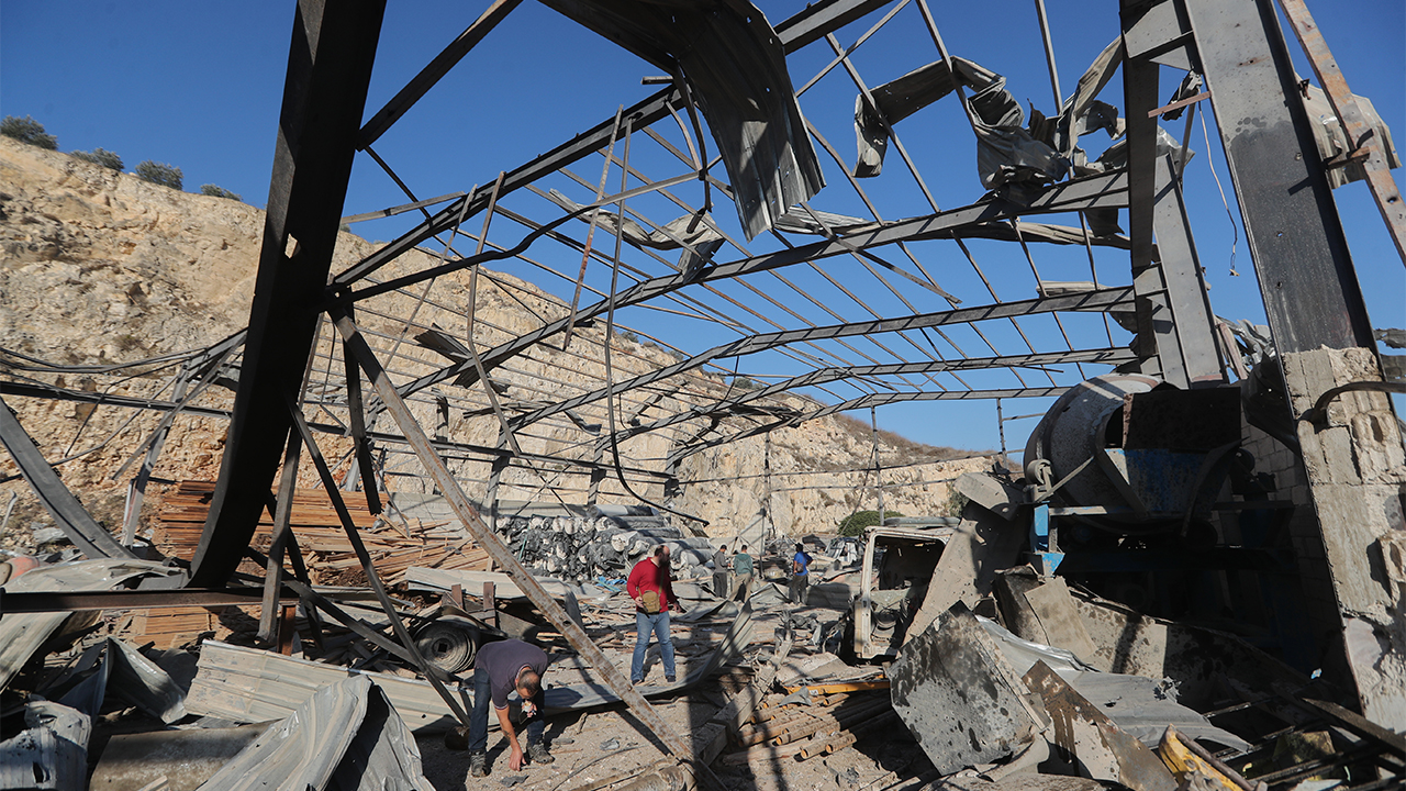 ▲ 현지시간 10월 17일, 레바논 남부 마을에서 이스라엘 공습으로 파괴된 시멘트 공장 현장을 사람들이 바라보고 있다.