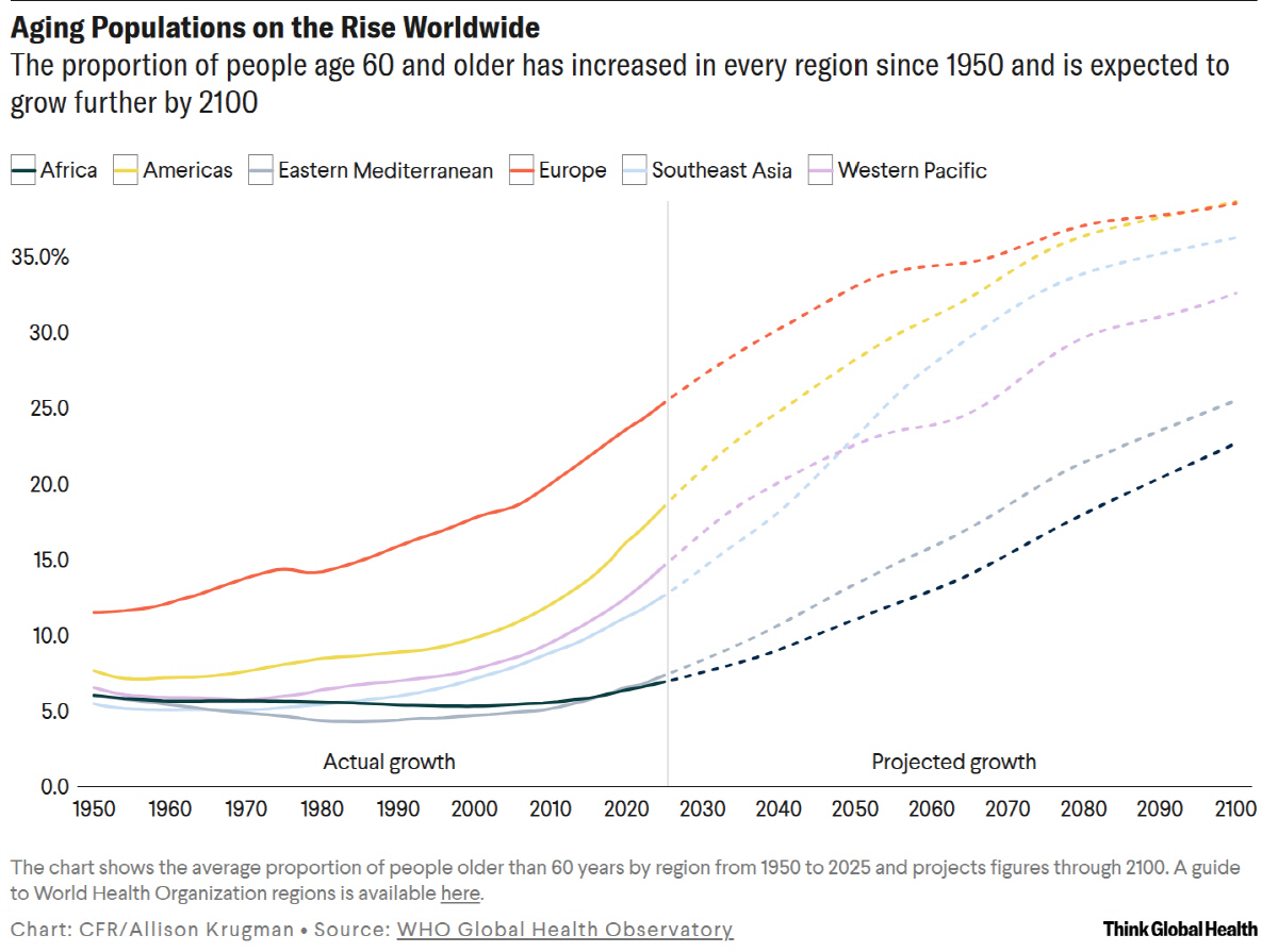 전 세계 지역별 60세 이상 인구 비율. ※2026년 이후는 예상치. 파란색=아프리카, 노란색=미국, 회색=동지중해, 빨간색=유럽, 하늘색=남아시아, 보라색=서태평양. |