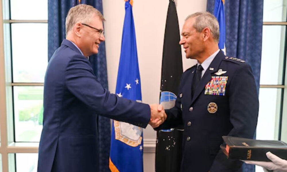 케네스 윌스바흐 미국 신임 공군참모총장(오른쪽)이 지난 3일(현지시간) 펜타곤에서 취임 선서를 마친 뒤 직속 상관인 트로이 마인크 공군장관과 악수하고 있다. 미 공군 홈페이지 |
