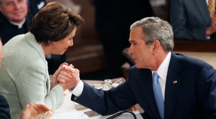 보통 대통령이 주요 참석자와 함께 상원 의장을 겸하는 부통령, 의회의 실질적 리더인 하원 의장에게 인사하는데 이날 부시가 “마담 스피커라 말할 수 있어 영광”이라며 입을 떼자 의회 내 앉아 있던 공화·민주당 의원들이 기립 박수를 쳤다. 최근 작고한 딕 체니 부통령이 펠로시의 왼쪽에 앉아 있었는데, 계속 박수를 치자 펠로시는 수줍은 표정을 짓더니 두 손을 모은 채로 자리에서 일어났다 앉았다. 부시의 덕담은 여기서 그치지 않았는데 펠로시 부친이자 메릴랜드주(州) 볼티모어 시장, 연방 하원 의원을 지낸 고(故) 토머스 달레산드로 주니어를 호명하며 “생전에 이 연단에 있는 루스벨트·트루먼 대통령의 연설을 지켜봤지만, 오늘 밤 그의 외동딸인 낸시가 의장으로 있는 것을 보는 것만큼 감동적인 일은 없었다”고 했다. 다시 한번 기립 박수가 쏟아졌고, 부시는 뒤로 돌아 펠로시와 악수했다.