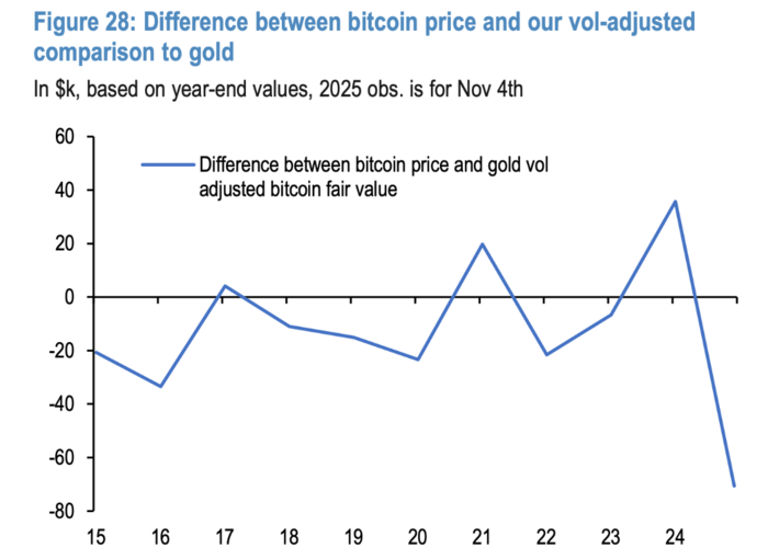 JP모건이 분석한 ‘비트코인 실제 가격과 금 기준 변동성 조정 적정가치(0선)’의 차이. 2024년 내내 고평가 상태였던 비트코인 가격(파란 선)은 올해 들어 급락해 11월 4일 기준 적정가치보다 약 6만 8000달러 낮은 ‘역대급 저평가’ 구간에 진입했음을 보여준다. [자료=JP모건] |