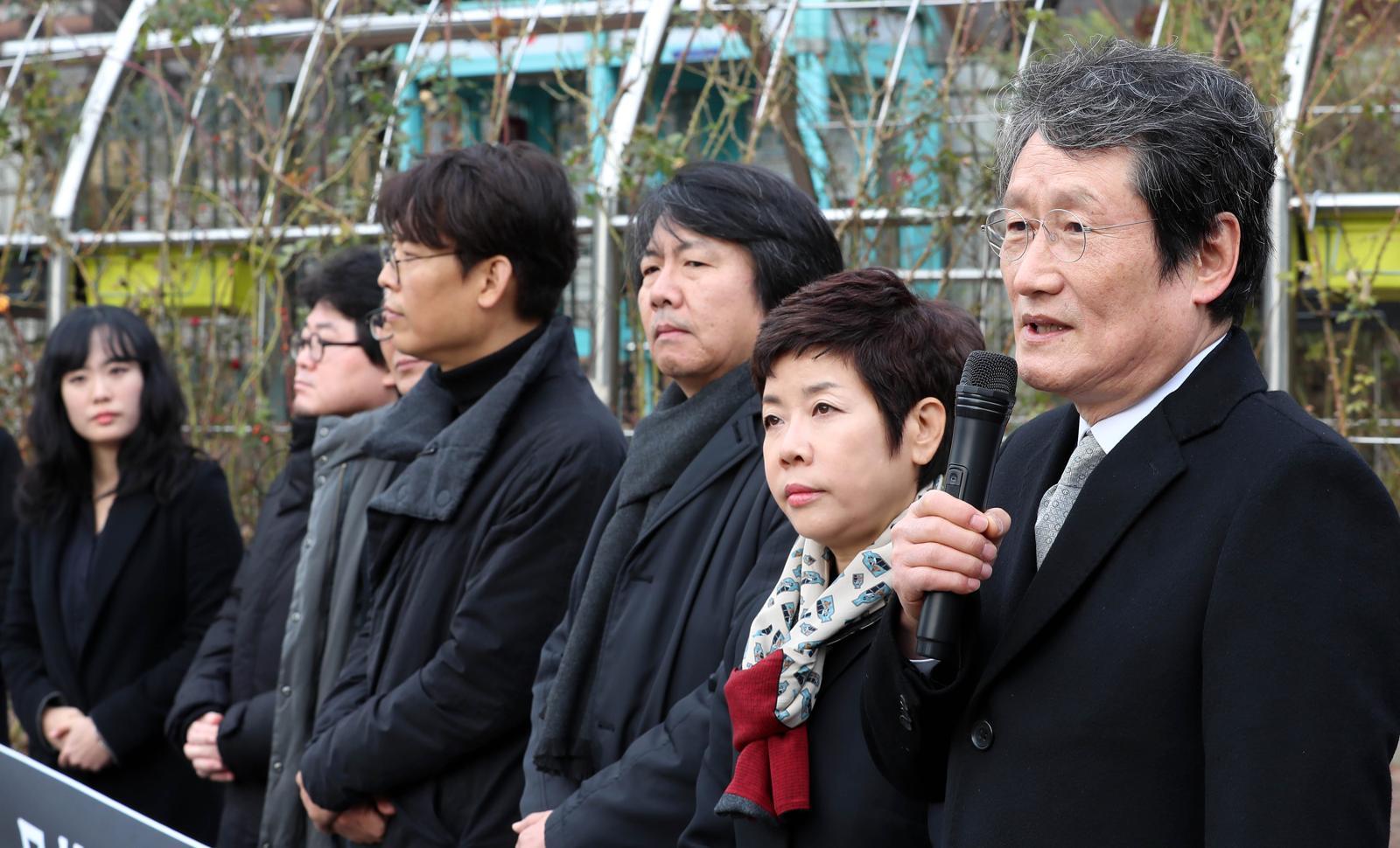 배우 문성근과 방송인 김미화를 비롯한 참석자들이 28일 오전 서울 서초구 서울중앙지방법원 정문 앞에서 MB정부 문화예술계 블랙리스트 국가배상 기자회견을 하고 있다. 2017.11.28. 뉴시스 |