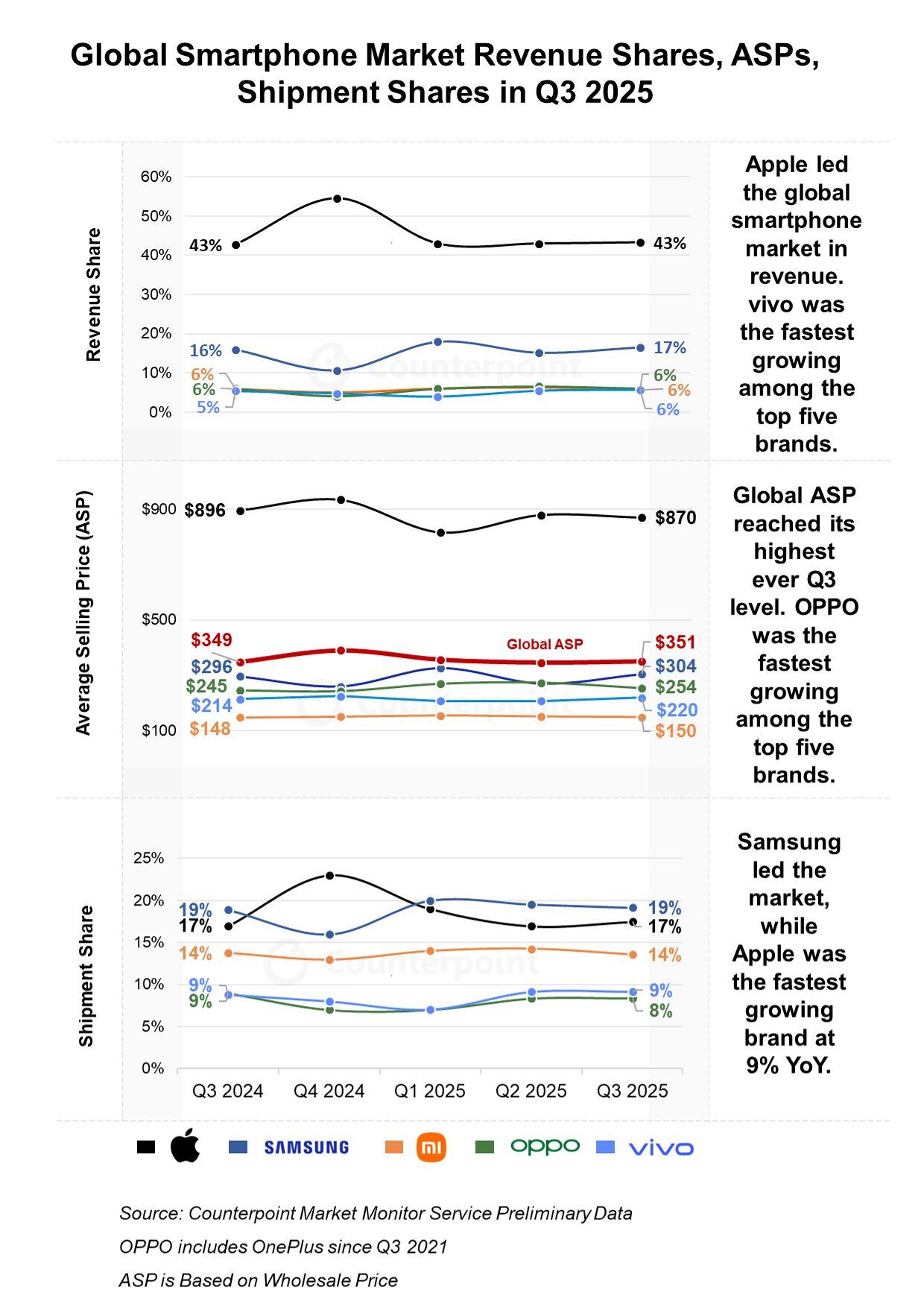 실피 자인 카운터포인트리서치 책임연구원은 “전 세계 스마트폰 평균판매단가(ASP)는 351달러로 3분기 기준 역대 최고치를 기록했다”며 “이는 고가 기기로 업그레이드하는 성숙 사용자층 확대에 따른 글로벌 프리미엄화 추세의 영향”이라고 분석했다.