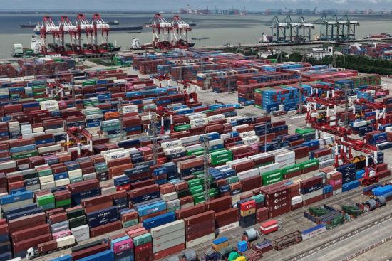 7일(현지시간) 중국 상하이항에 적재된 컨테이너의 모습. AFP연합뉴스 |