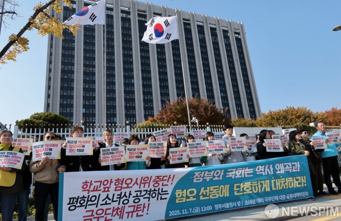 [서울=뉴스핌] 이길동 기자 =서울교육단체협의회, 소녕상 테러 극우단체 대응 공동대책위원회 관계자들이 7일 서울 종로구 정부서울청사 앞에서 학교 앞 혐오 시위 중단하라! 평화의 소녀상 공격하는 극우단체 강력 규탄 및 정부·국회 단호한 조치 촉구 기자회견을 하고 있다.2025.11.07gdlee@newspim.com