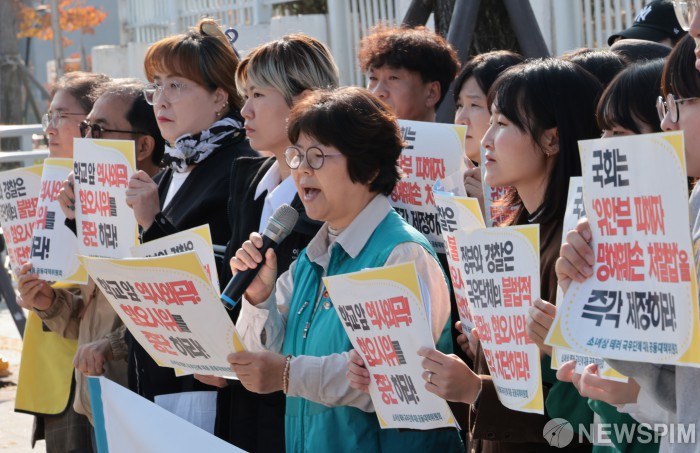 [서울=뉴스핌] 이길동 기자 =서울교육단체협의회, 소녕상 테러 극우단체 대응 공동대책위원회 관계자들이 7일 서울 종로구 정부서울청사 앞에서 학교 앞 혐오 시위 중단하라! 평화의 소녀상 공격하는 극우단체 강력 규탄 및 정부·국회 단호한 조치 촉구 기자회견을 하고 있다.2025.11.07gdlee@newspim.com