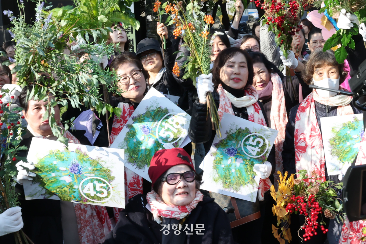 7일 서울중앙지법 560호 법정의 방청석 앞줄에 붉은 꽃이 그려진 스카프를 맨 여성 13명이 모여 앉았다. 머리가 희끗희끗하고 지팡이를 잡은 이들은 서로의 표정을 걱정스럽게 살피며 끌어안았다. 누군가 눈물을 쏟으면 서로의 등을 토닥여줬다.