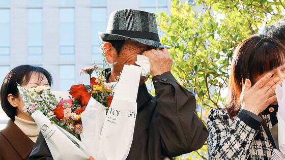 지난달 28일 오후 광주 동구 광주고등법원 앞에서 '청산가리 막걸리 살인 사건'의 피고인이 사건 발생 16년 만에 재심에서 무죄를 선고 받고 눈물을 훔치고 있다. 연합뉴스 |