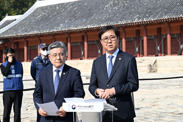 최휘영 문화체육관광부 장관(오른쪽)과 허민 국가유산청장이 7일 낮 서울 종묘 정전 앞에서 서울시의 종묘 앞 재개발 계획에 반대하는 기자회견을 열고 있다. 국가유산청 제공 |