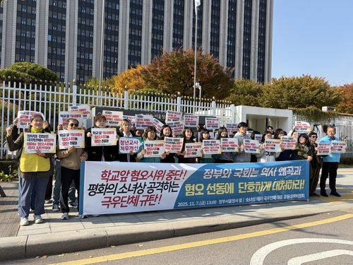 서울교육단체협의회·소녀상 테러 극우단체 대응 공동대책위원회는 7일 정부서울청사 앞에서 기자회견을 열어 "위안부법폐지국민행동 등 극우 단체가 평화의 소녀상에 대한 모욕과 테러를 지속하고 있고, 그 행위가 학생들의 학습권과 인권을 심각하게 침해하는 학교 앞 혐오 시위로까지 번지고 있다"며 이같이 말했다.