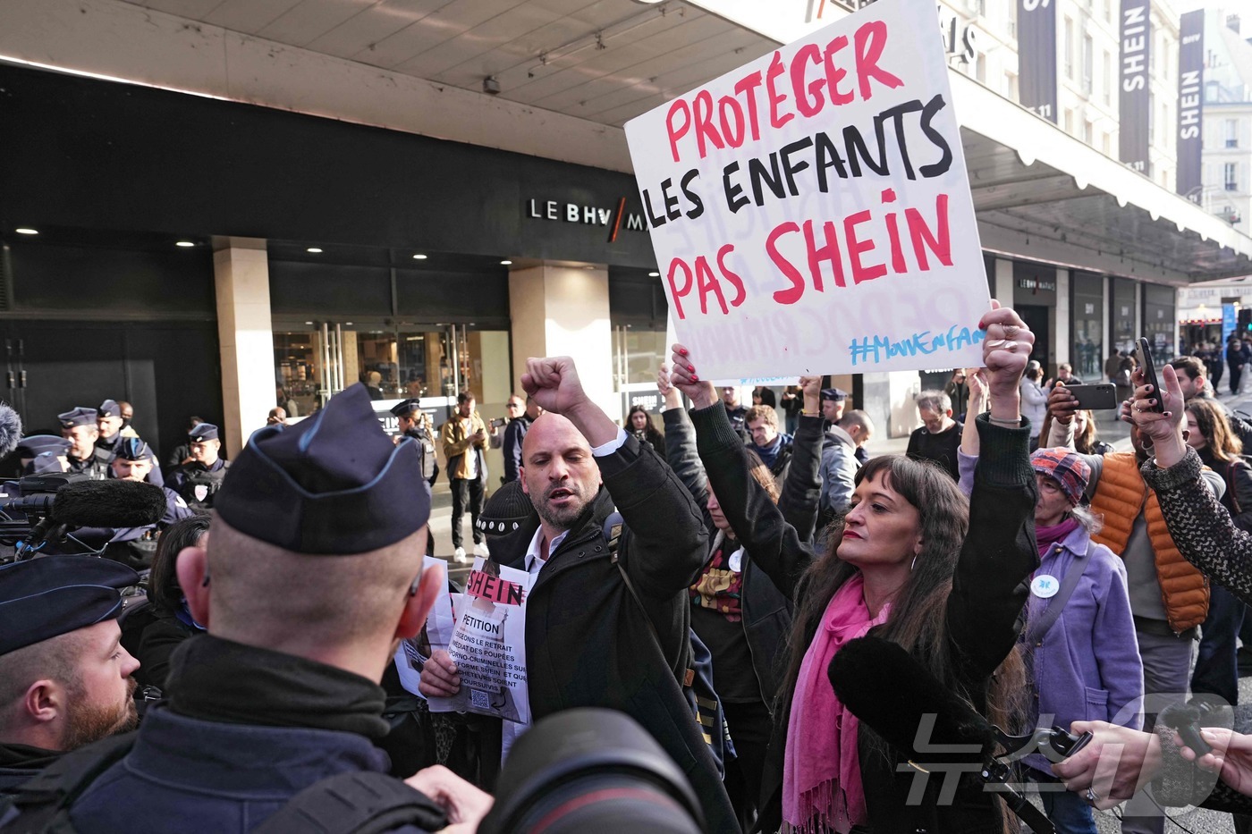 아동폭력 근절 시민단체 무방팡(Mouv'Enfants)의 대표 아르노 갈레(가운데)가 수잔 프뤼지에 무방팡 사무총장(오른쪽) 옆에서 "어린이를 보호하라. 셰인은 보호하지 마라(Protéger Les Enfants Pas Shein)"고 쓰인 플래카드를 들고 시위를 벌이고 있다. 2025.11.05. ⓒ AFP=뉴스1 ⓒ News1 이정환 기자 |
